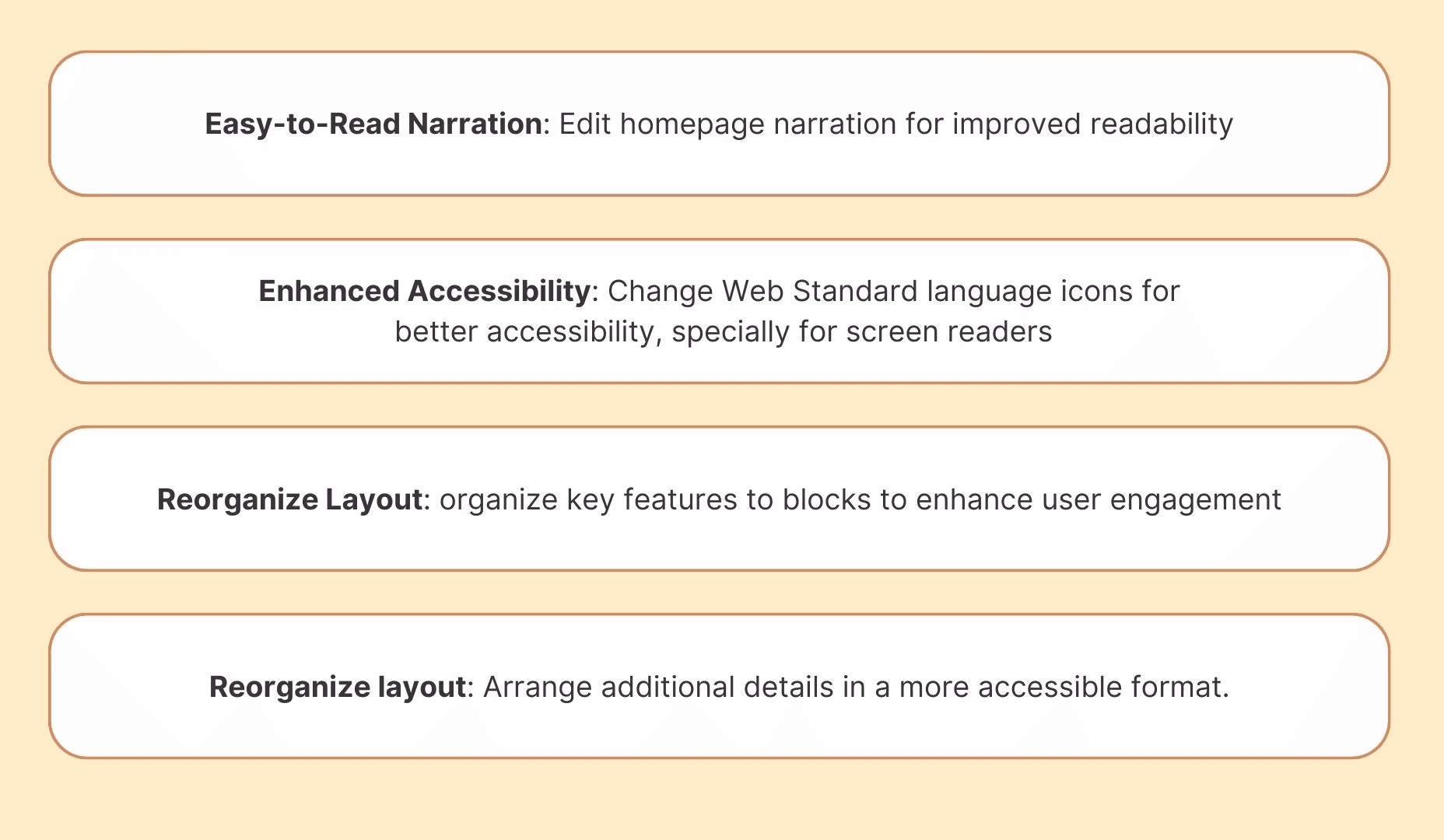 Text-heavy design cluttered the page, making it hard for users to focus on individual sections.