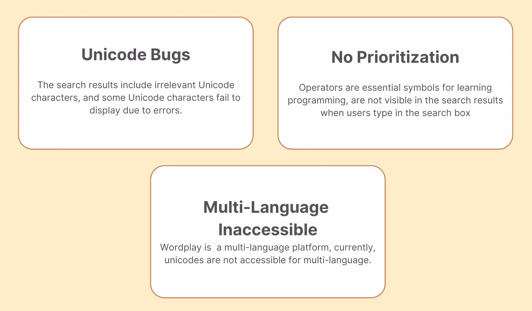 Our current design includes all Unicode glyphs and symbols, but they are only accessible with English descriptions. This limits the Wordplay search box to English, failing to yield results for terms in other languages. For instance, searching for 'Comida' (Spanish for 'Food') in both English and Spanish settings produces no results.