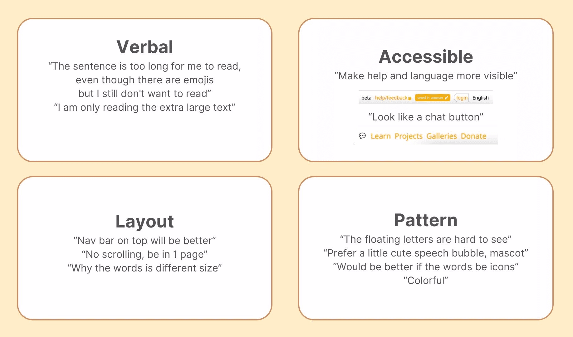I conducted user interviews to gather feedback and identified key pain points in the current homepage design, organizing the issues into four main areas.